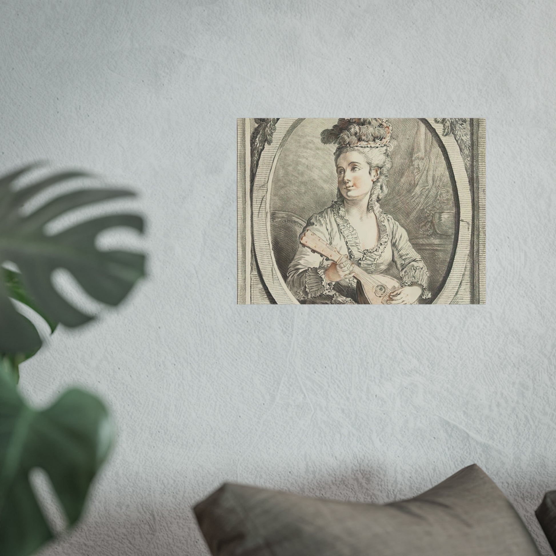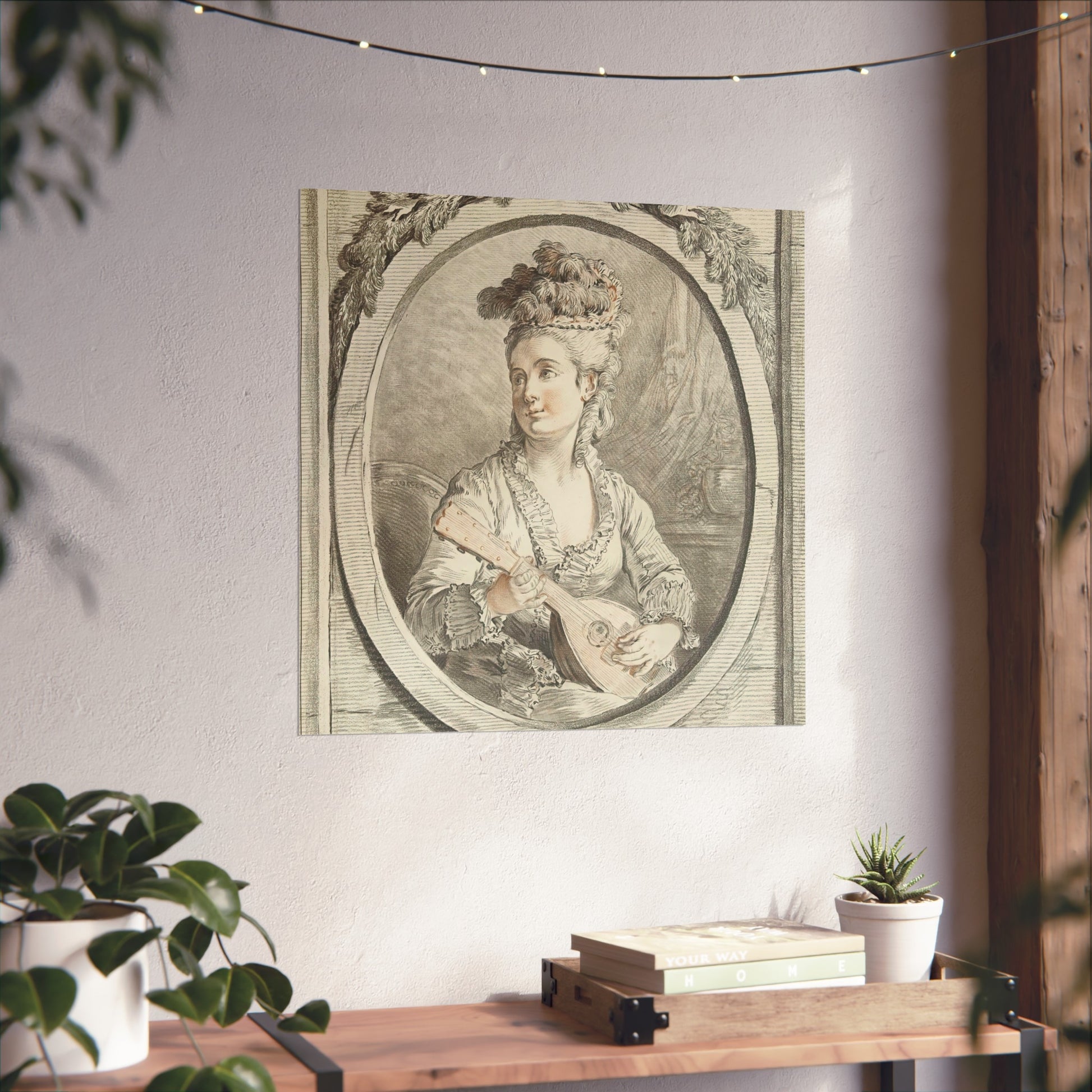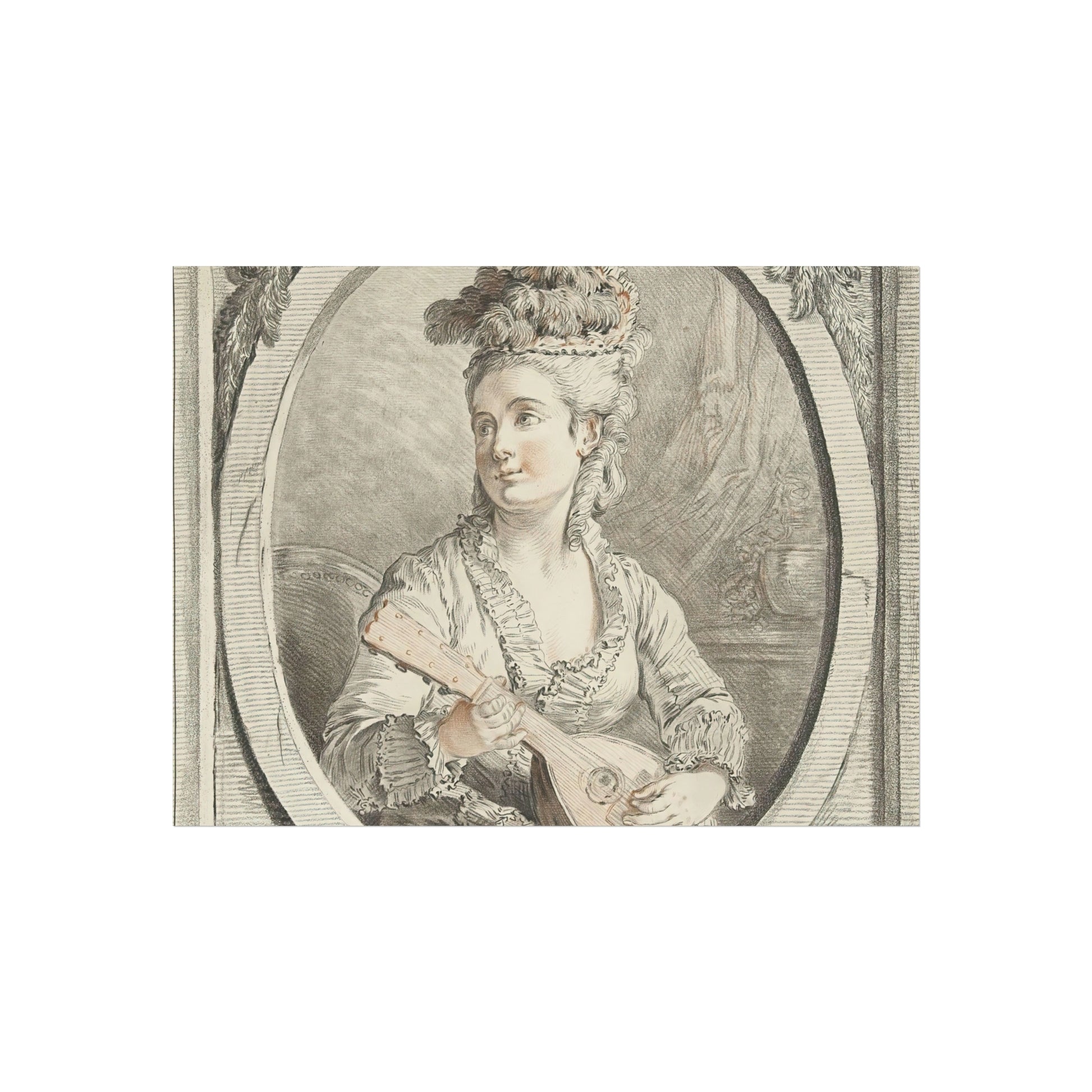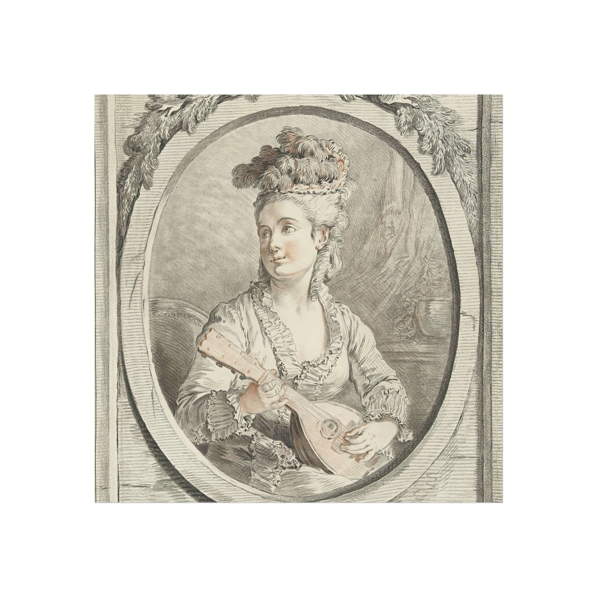 Immerse yourself in the serene world of 'Woman with a Lute' by Gilles Demarteau. This captivating painting portrays a woman delicately playing a lute, lost in her music. The oval frame adds an intimate touch, drawing viewers closer to her tranquil expression and the soft, harmonious atmosphere. It's a beautiful blend of artistry and emotion, capturing a timeless moment of musical reverie.