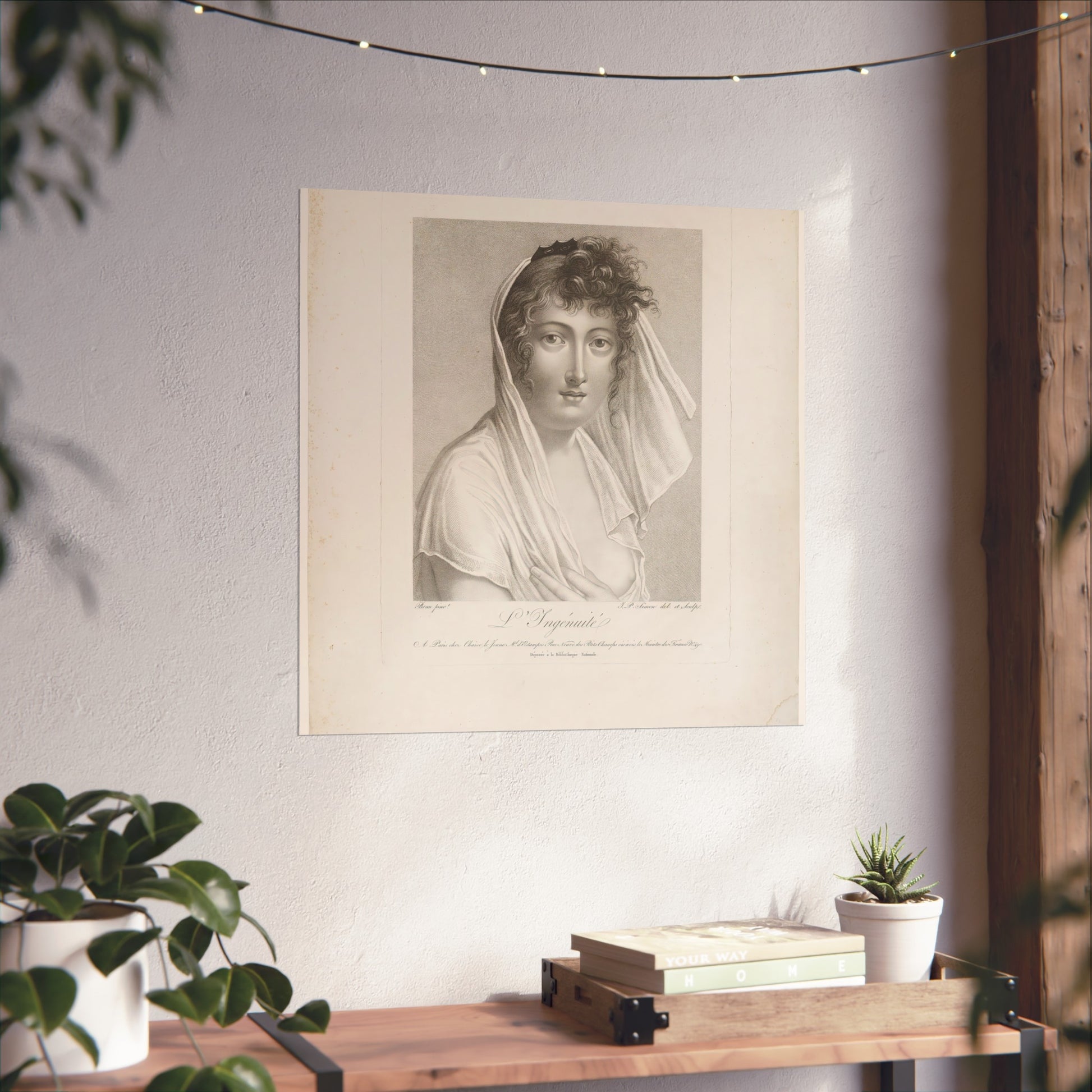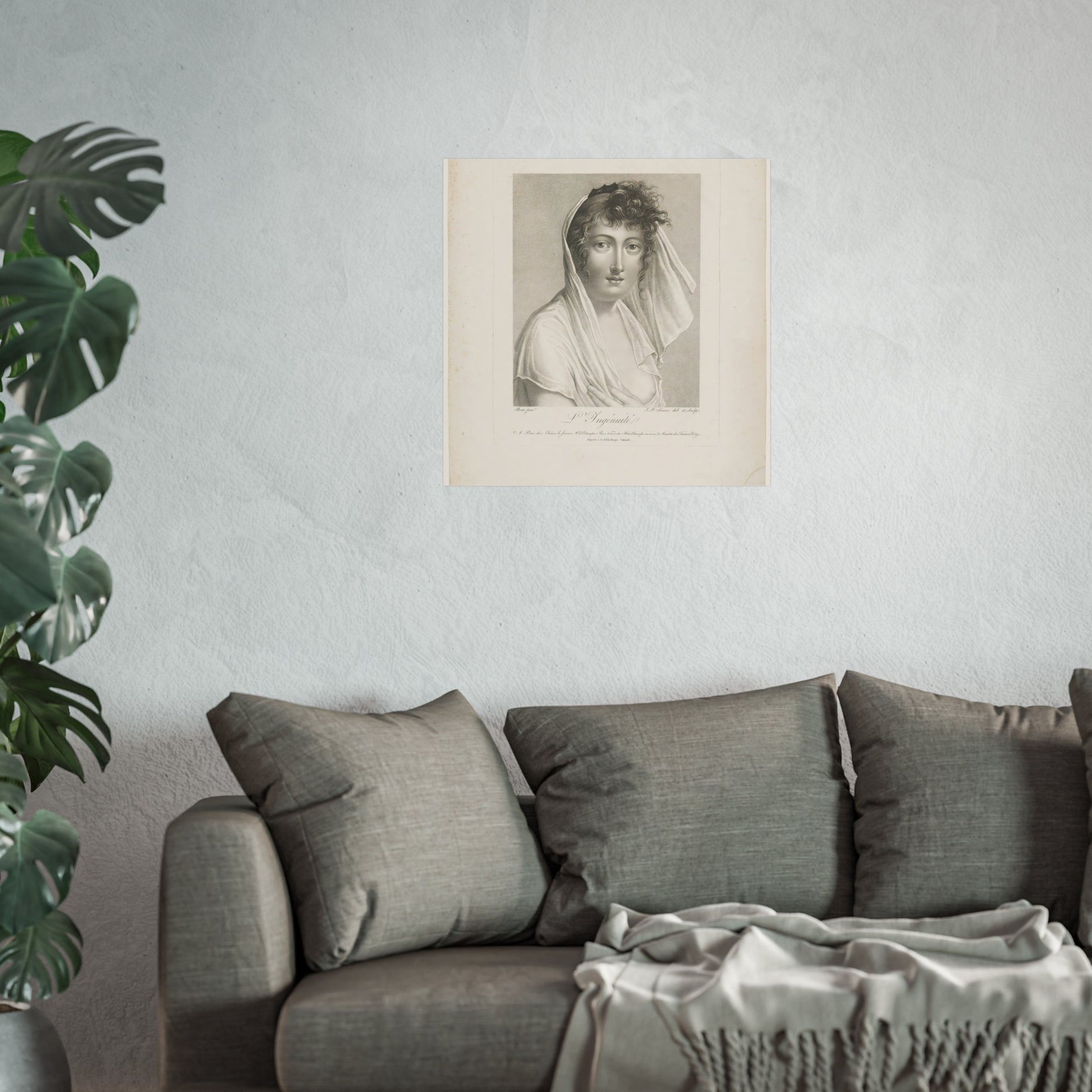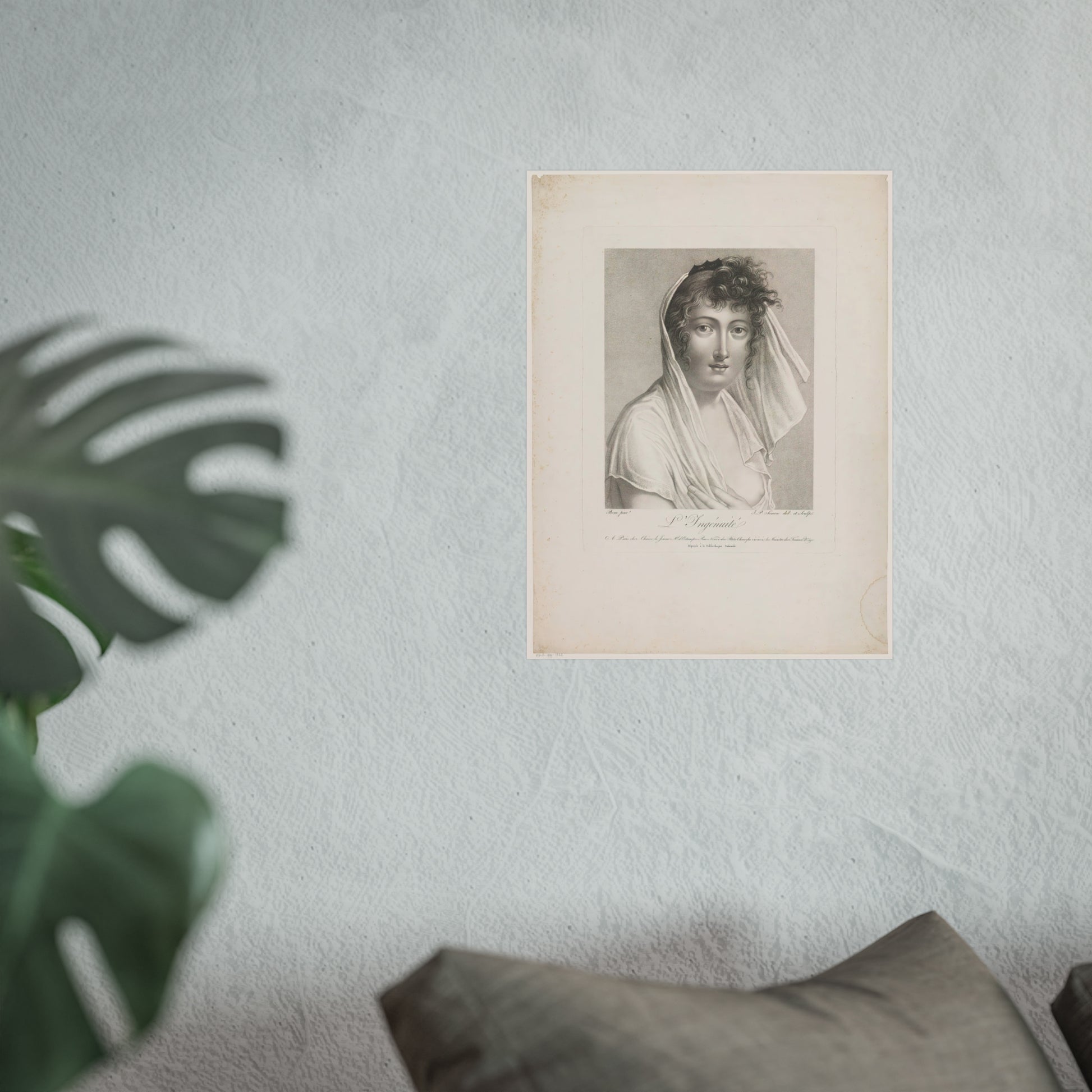 A captivating bust of a female figure, turned to the right, with a veil gracefully draped over her head. Her exposed breast adds an element of vulnerability and beauty to the composition.